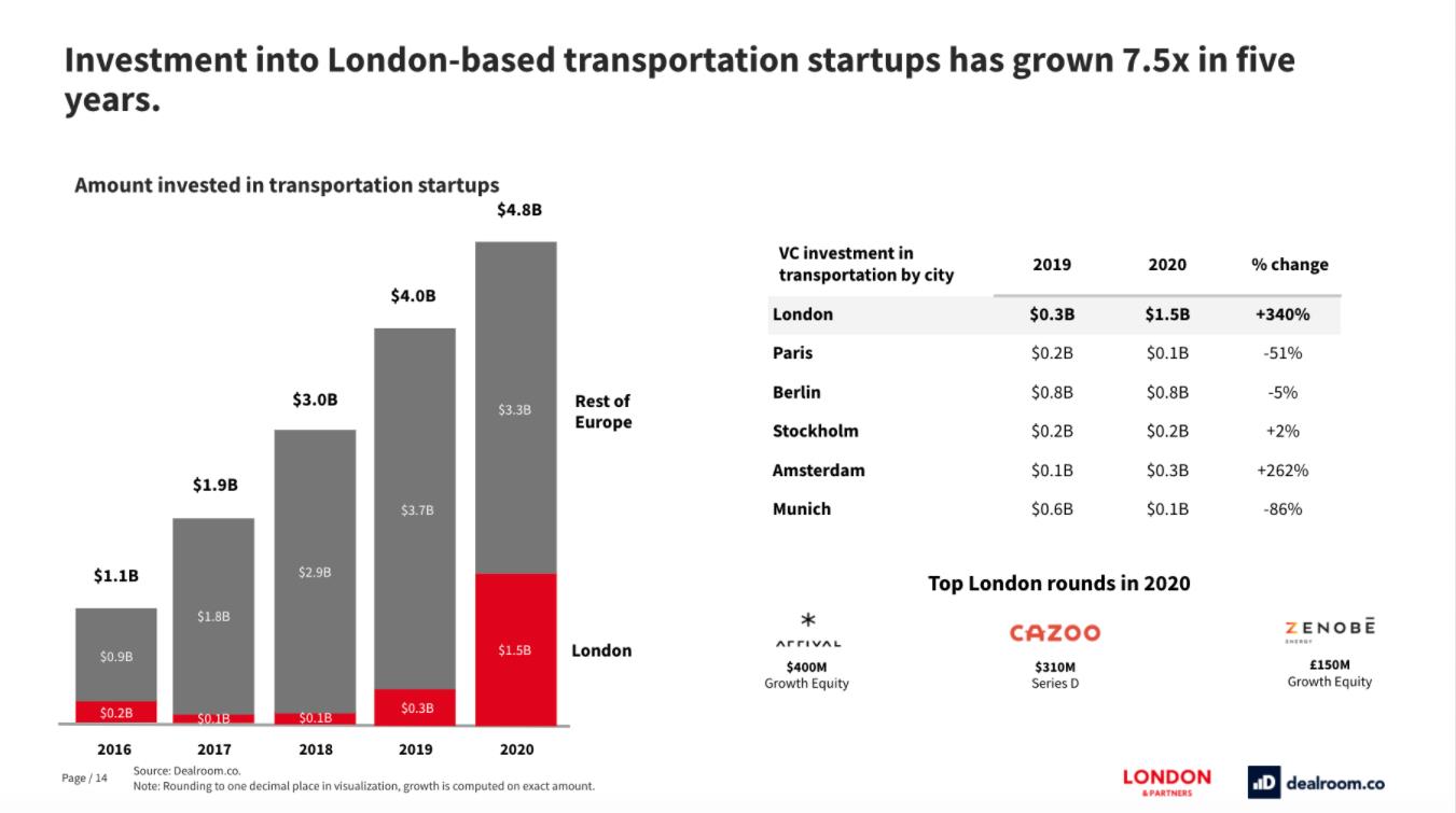 另外,对伦敦交通科技初创公司的投资在5年内也增长了7.5倍,其中Arrival和Cazoo在2020年领先。