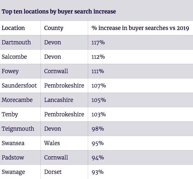 与2019年相比 ,德文郡的Dartmouth咨询了增长最大( 117%),其次是Salcombe ( 112%),和康沃尔郡的Fowey (111%)。