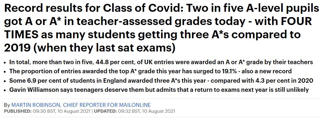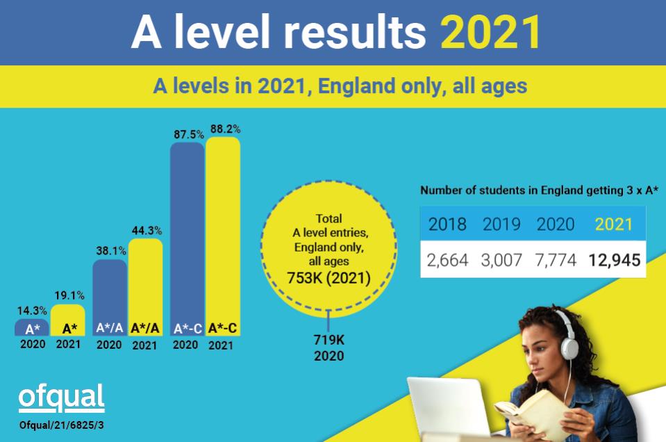 而且,有12,945(约占6.9%)的学生至少获得了3个A*,相比之下,2020年和2019年的这一数据分别是4.3%和1.6%。