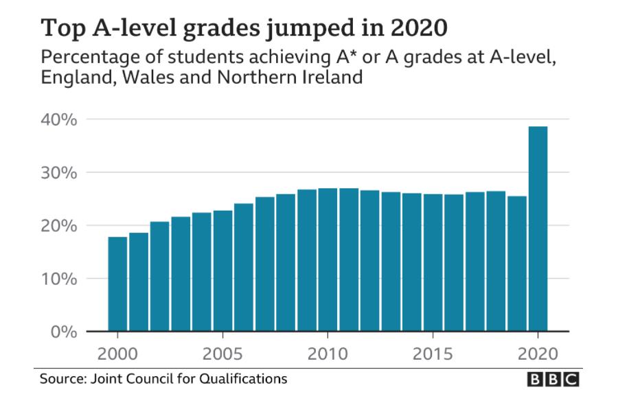 然而,这一评分机制的转变却导致A-Level成绩大幅膨胀,高分比例远超往年,这也导致分数出现了严重贬值。