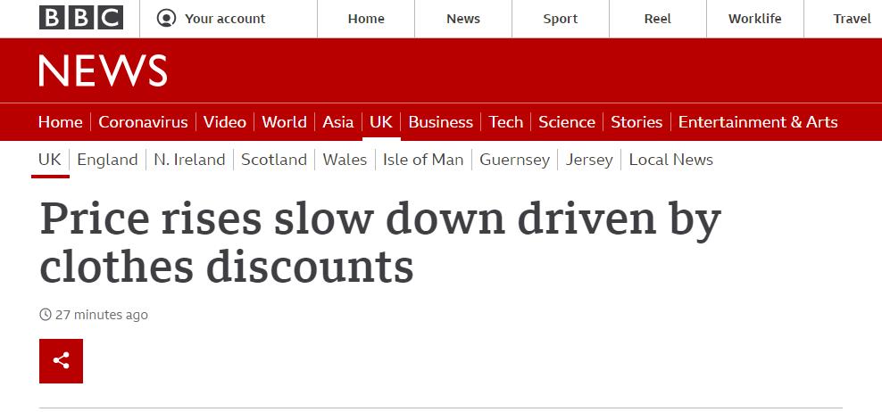 ONS表示,通胀回落是由服装和鞋类价格下跌导致的,这一价格下跌也在很大程度上抵消了运输价格的上涨。