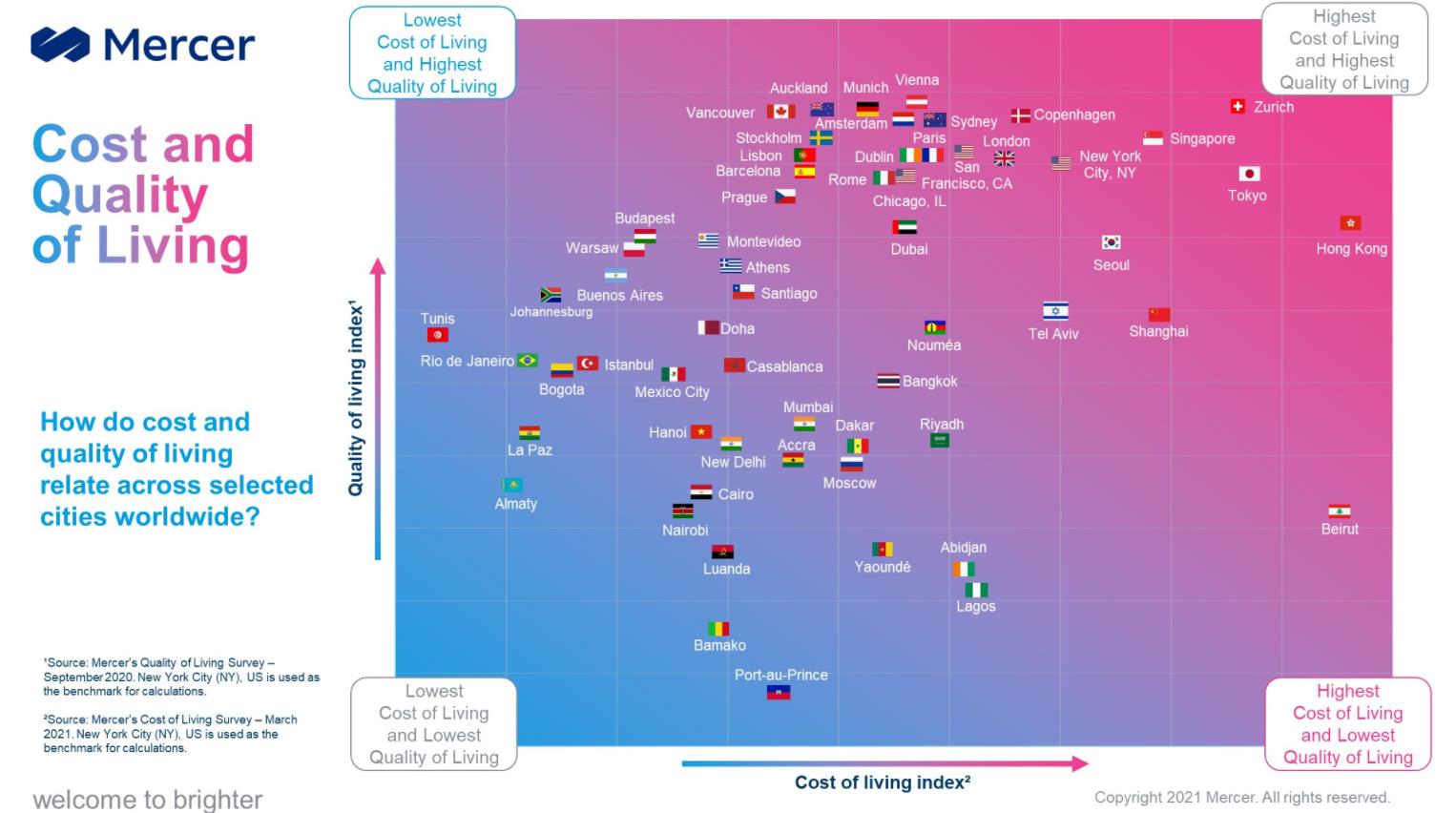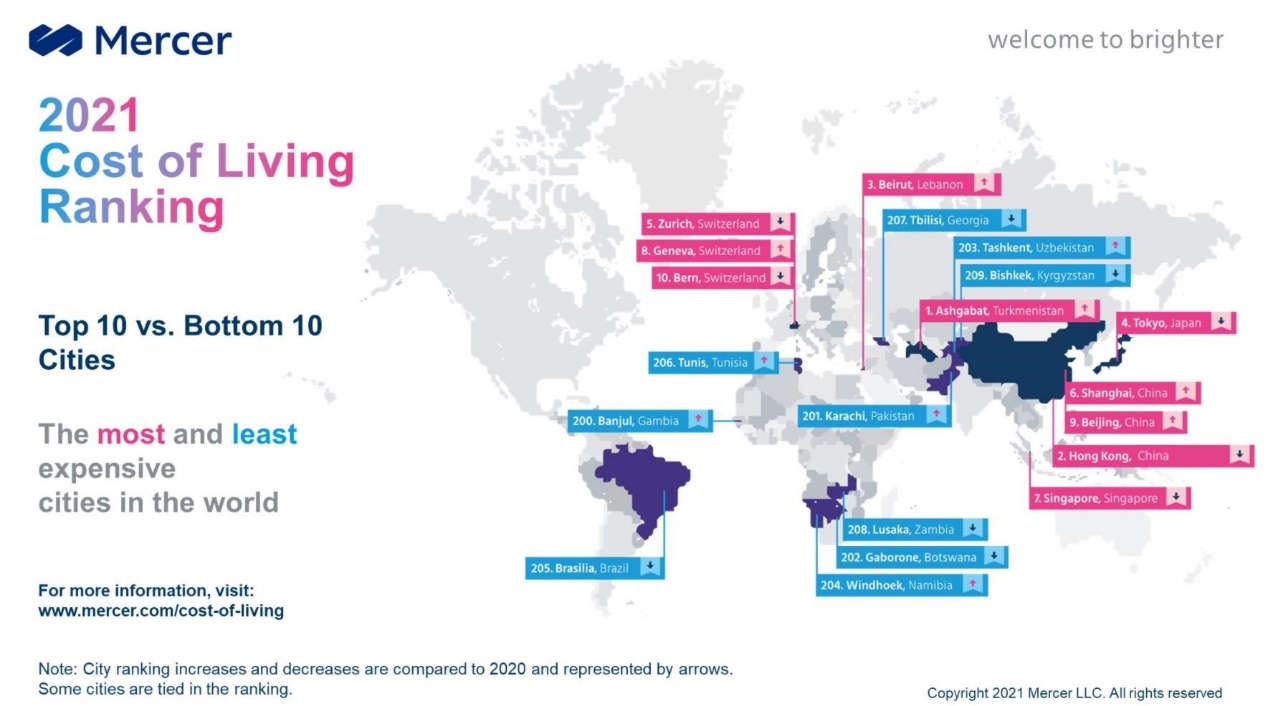 近日,美世咨询公司发布了最新的《美世生活成本调查(Mercer Cost of Living Survey)》,对全球生活成本最高的城市进行了排名。