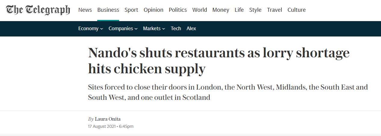 卡车司机短缺导致原料供应链受影响,连锁餐饮Nando \’s已被迫关闭近50家餐厅,并缩短了部分门店的营业时间,其外卖业务也受到了波及…