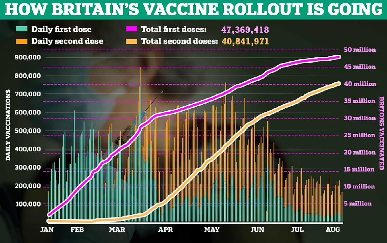 数据显示,英国目前有超过4,736万人接种了第一剂疫苗,超过4,084万人完全接种了两剂疫苗。