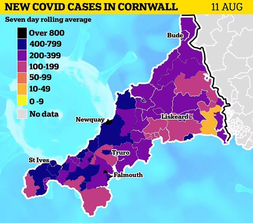 数据显示,在截至8月11日的一周内,Newquay West的感染率为每10万人中确诊1,067人。