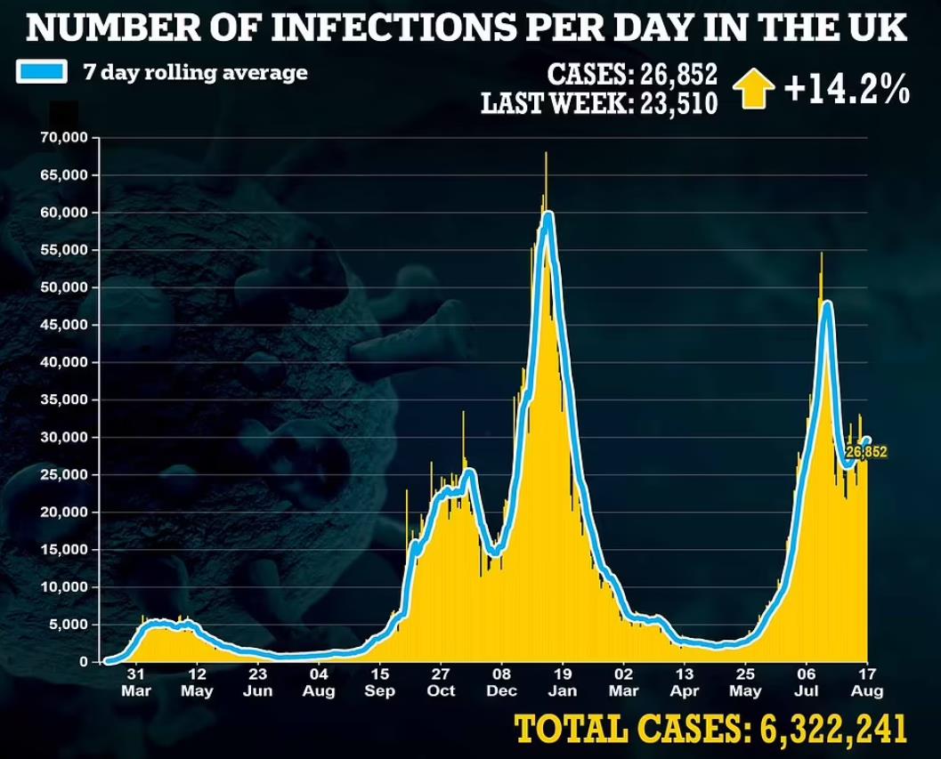 最新官方数据显示,本周二,英国新冠新增确诊26,852人,较上周同期增加14.2%。