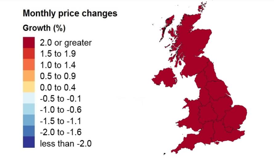 与5月份相比,英国平均房价环比上涨4.5%,几乎所有地区的涨幅都在2%以上。