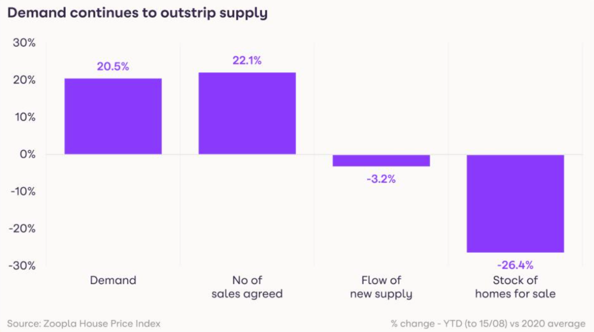 - Zoopla数据显示:英国房地产市场正面临“2015年以来最大的库存短缺”。可供购买的住房供应量比去年的平均水平低了四分之一以上(-26%),而且“严重”的库存短缺可能会持续到2022年。