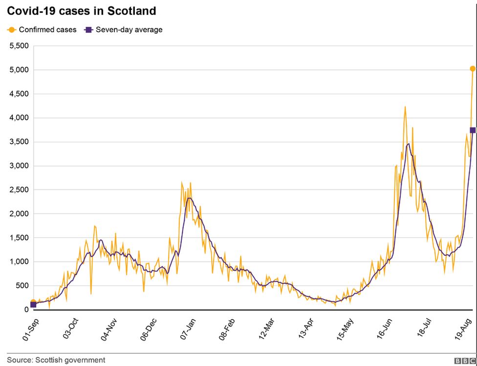 苏格兰学生返校,引发新冠感染人数猛增!数据显示,最近几天有大量年轻人检测呈阳性。中学生继续在学校戴口罩的理由“越来越强烈”。