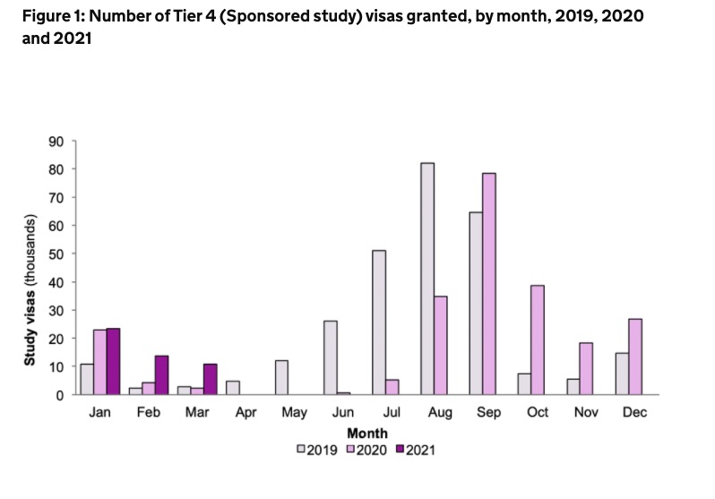 英国最新的官方数据显示:在截至2021年3月的一年中,共发放了250,683份学习签证。