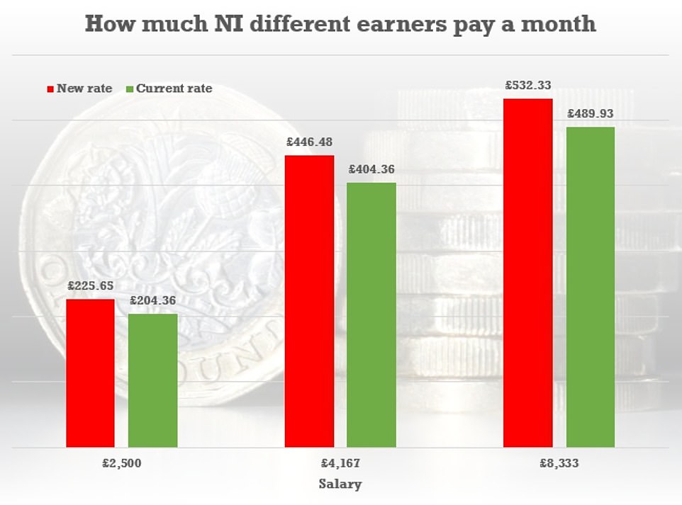 提高NI的情况下,年入3万英镑的纳税人将每年额外支付255英镑。增税将使年薪2万英镑的员工多支出130英镑。年薪4万英镑的员工多支出380英镑。年薪5万英镑多支出500英镑。年薪6万英镑的员工多支出630英镑。