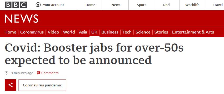 英国将公布第三剂加强疫苗计划,所有50岁以上人群都可接种,主要接种辉瑞疫苗…