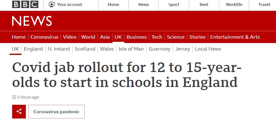 英格兰地区所有12至15岁的儿童都将接种第一剂辉瑞疫苗,政府将寻求家长同意,但孩子可自主决定…
