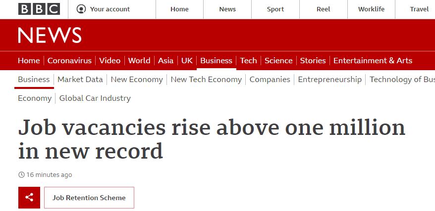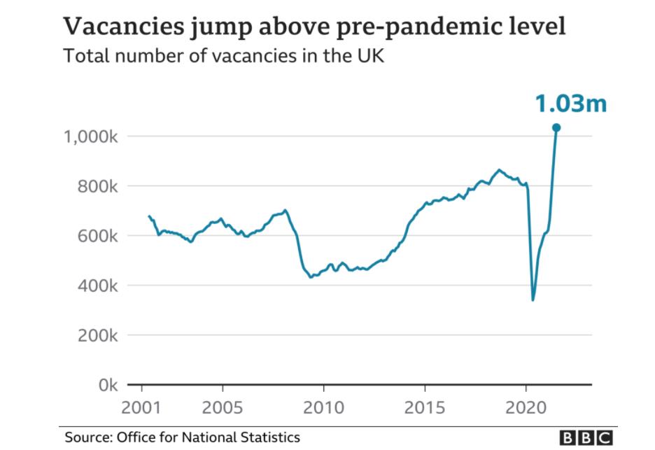 英国国家统计局(ONS)的最新数据显示,随着经济持续复苏,职位空缺创下新高。