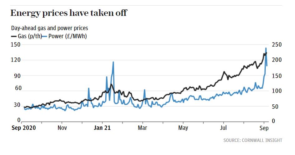 而天然气价格的上涨也影响到了电力成本,因为英国超过30%的电力是由燃气发电厂产生的。