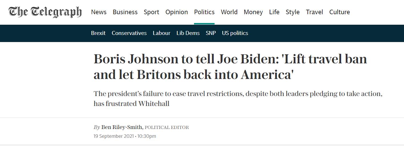 鲍里斯开启访美之旅,将敦促拜登改变美国的新冠入境规则,允许完全接种过两剂疫苗的英国人自由前往美国…