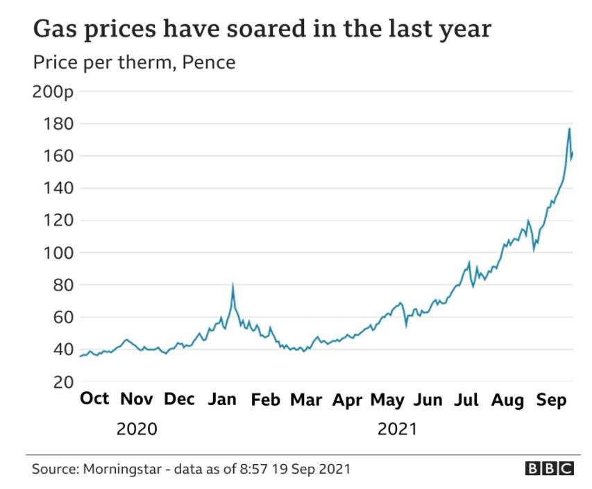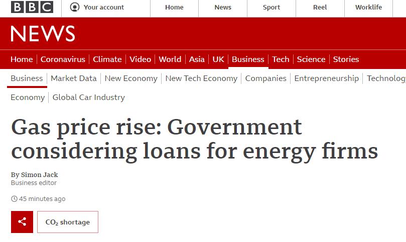 据媒体表示,在过去的一个月里,已有5家能源供应商被迫关闭,英国最大的两家化肥厂也已经停产。为英国170万客户提供能源的供应商Bulb,也是寻求救助的供应商之一。