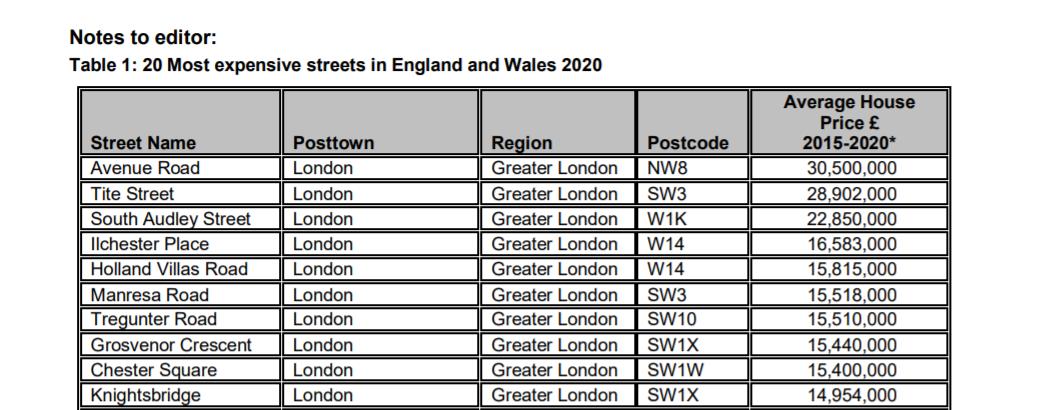 在劳埃德的评选中,位于伦敦西北部圣约翰伍德(St John\’s Wood)的Avenue Road拔得了最贵街区榜单的头筹。2020年,当地的平均房屋售价达到了3,050万英镑,约合人民币2.69亿元,是英国平均房价的120多倍。