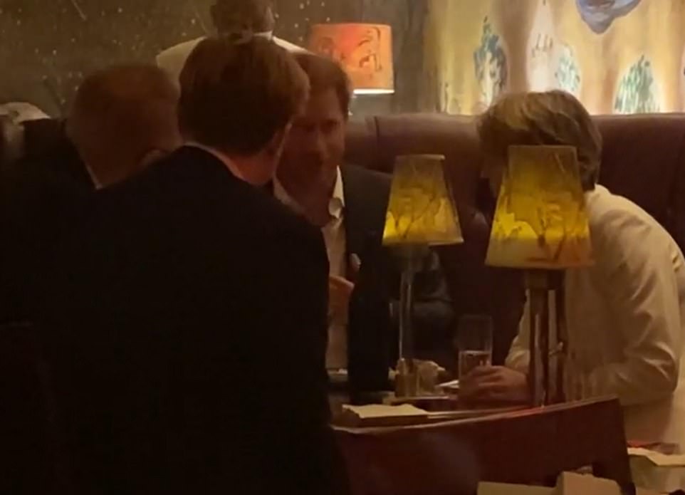 媒体拍到哈里王子手持白葡萄酒,好像在开会,大概45分钟后,哈里拿着iPad和笔记本离开了。