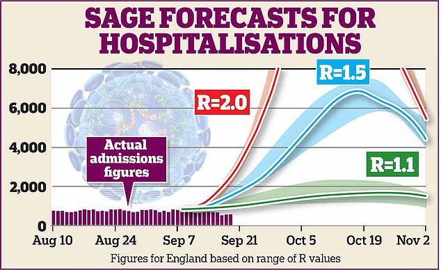 Sage曾警告说,随着复工复学,到10月中旬,每天住院人数可能会达到2,000至7,000人。如果R值在1.1,则为每日2千人住院治疗,如果R值为1.5,则为每日七千人住院。最后将超过之前冬天时4,309人的峰值,当时NHS逼近崩溃的边缘。
