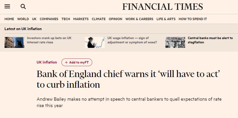 英国央行行长安德鲁•贝利发出警告:该行无意与金融市场走势相悖,“将不得不采取行动”抑制通胀压力,业内预计央行将在今年年底前首次加息…