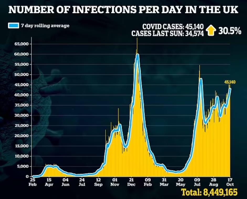 官方数据显示,10月17日,英国新冠新增确诊人数再次飙升至45,140例,较上一周激增了30.5%,这也是自7月以来的最高总数。