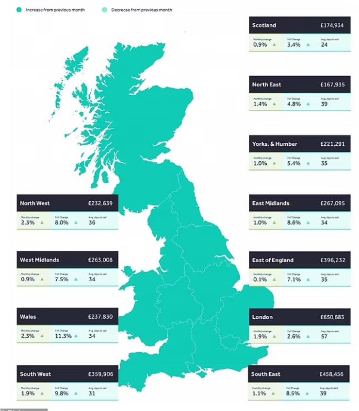 其中,首都伦敦的月度涨幅为1.9%,平均要价为650,683英镑,依旧为全英最高。