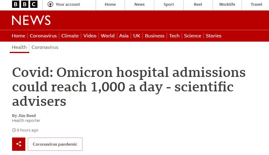 虽然尚未发现有人因感染Omicron住院,但英国政府科学咨询小组Sage委员会认为,如果没有新规则来抑制,那么到这波疫情高峰期时,每天Omicron住院患者可能会达到1,000-2,000例,NHS将不堪重负。