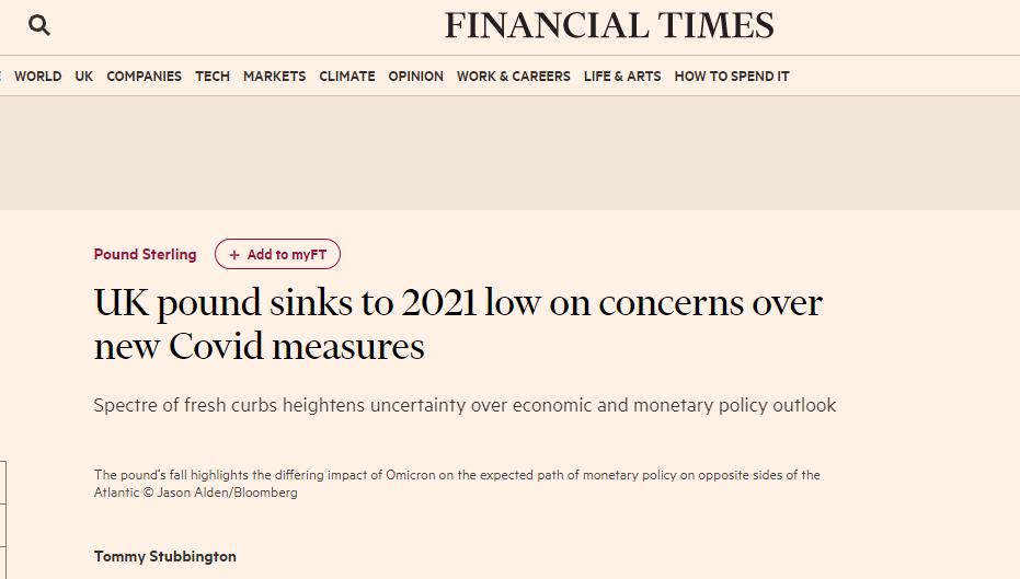 英镑的此轮下跌与英国收紧封锁措施有一定的关系,分析师们表示,政府此举将增加经济前景的不确定性,并可能阻止英国央行在本月晚些时候加息。