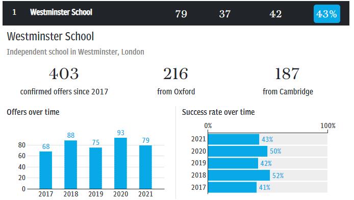 2021年,该校总共收到了79份来自牛剑的offer,其中,牛津37份,剑桥42份,录取率43%。