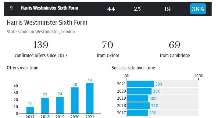 2021年,该校总共收到了34份来自牛剑的offer,其中,牛津23份,剑桥11份,录取率38%。