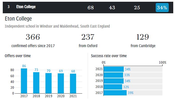 2021年,该学校总共收到了68份来自牛剑的offer,其中,牛津43份,剑桥25份,录取率34%。