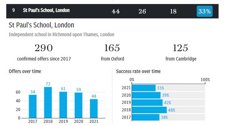 2021年,该学校总共收到了44份来自牛剑的offer,其中,牛津26份,剑桥18份,录取率33%。
