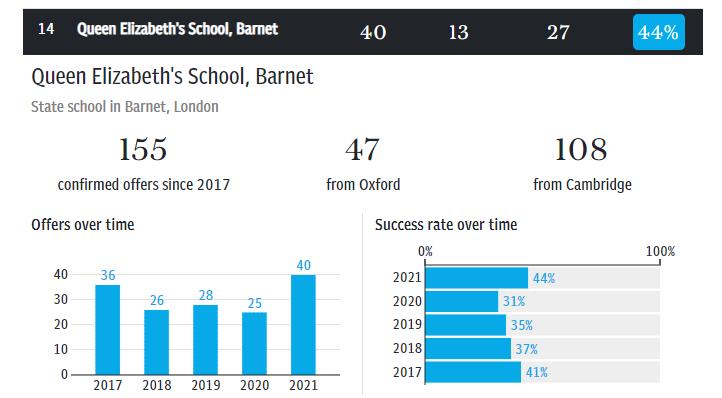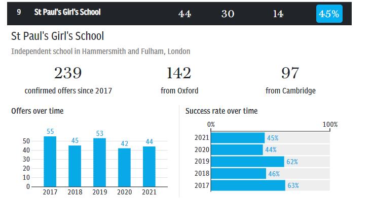 2021年,该学校总共收到了44份来自牛剑的offer,其中,牛津30份,剑桥14份,录取率45%。