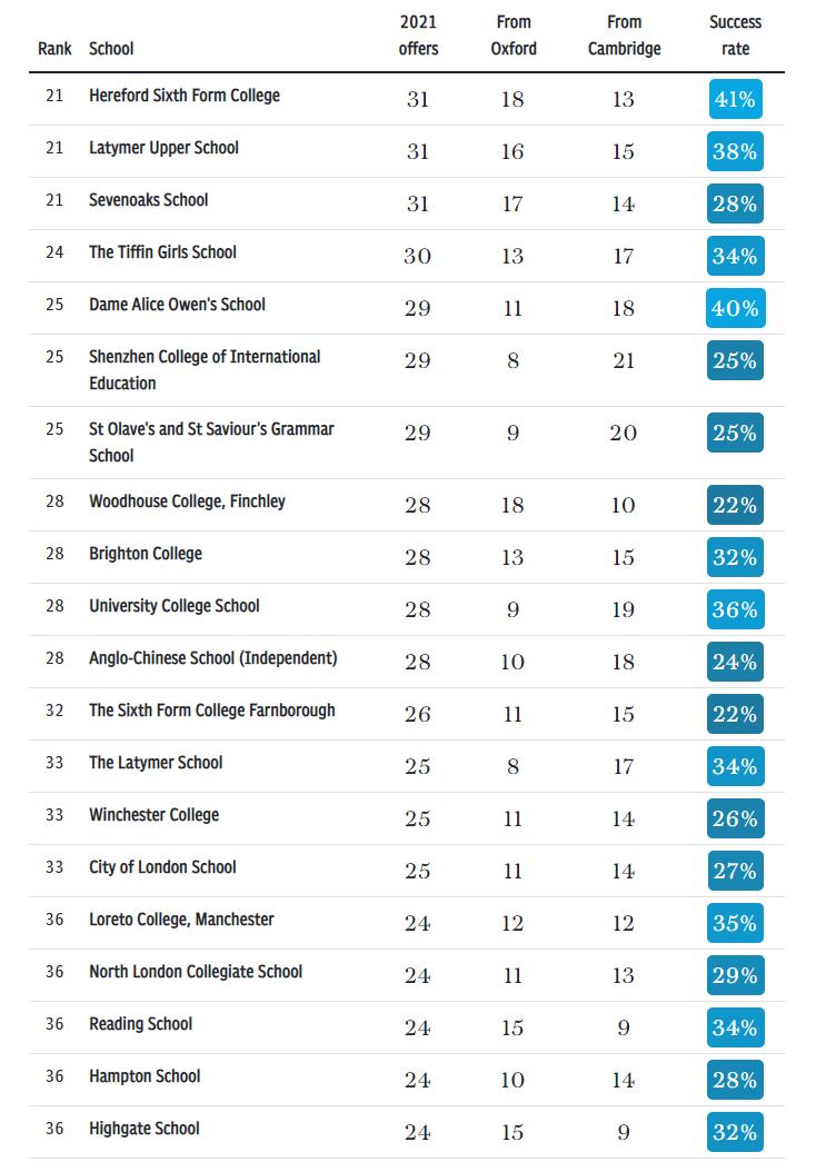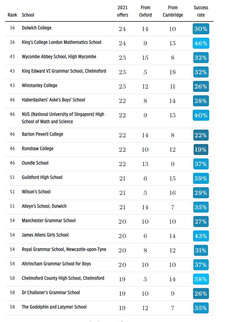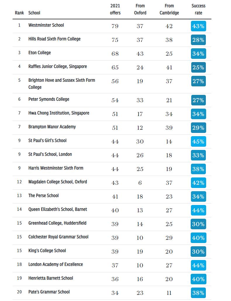 根据《The Telegraph 》的分析,2021年中,全球获得牛剑录取通知书(offer)数量最多的中学如下图所示。