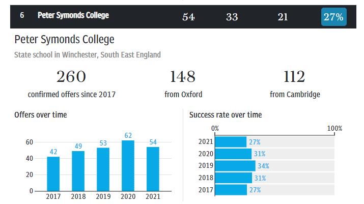 彼得·西蒙兹学院过去五年的牛剑录取情况如下: