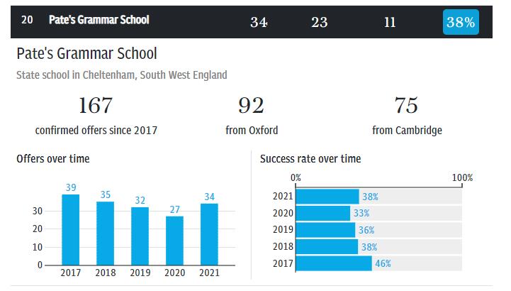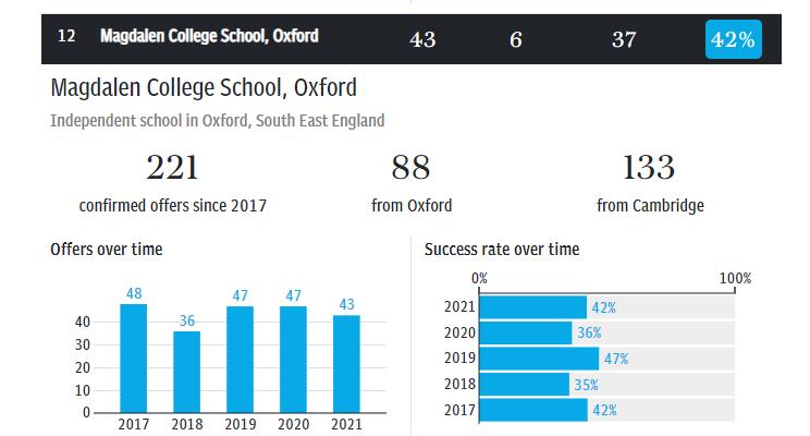 2021年,该学校总共收到了43份来自牛剑的offer,其中,牛津6份,剑桥37份,录取率42%。