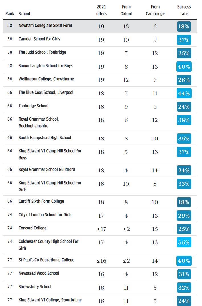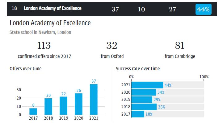 如果从录取率的角度来看,伦敦的表现也非常优秀,圣保罗女校(St Paul\’s Girl\’s School)、伊丽莎白女王学校(Queen Elizabeth\’s School)、伦敦卓越学院(London Academy of Excellence)这三所学校的牛剑录取率都达到了44%以上。