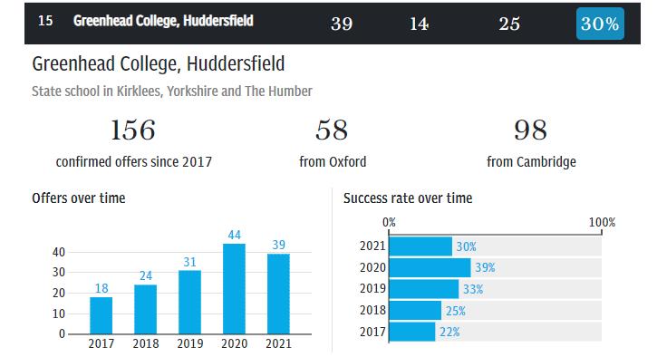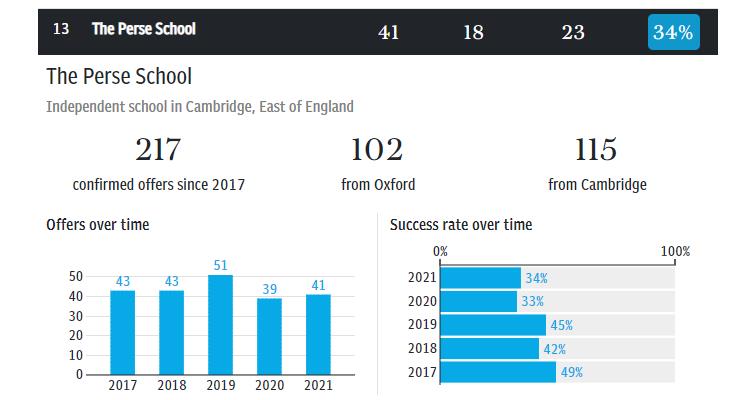 2021年,该校总共收到了51份来自牛剑的offer,其中,牛津12份,剑桥39份,录取率29%。