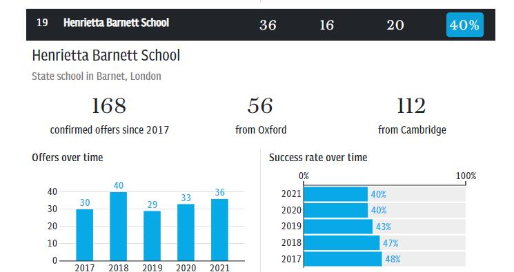 Henrietta Barnett学校过去五年的牛剑录取情况如下: