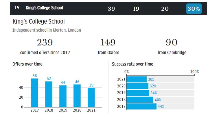 2021年,该学校总共收到了39份来自牛剑的offer,其中,牛津19份,剑桥20份,录取率30%。