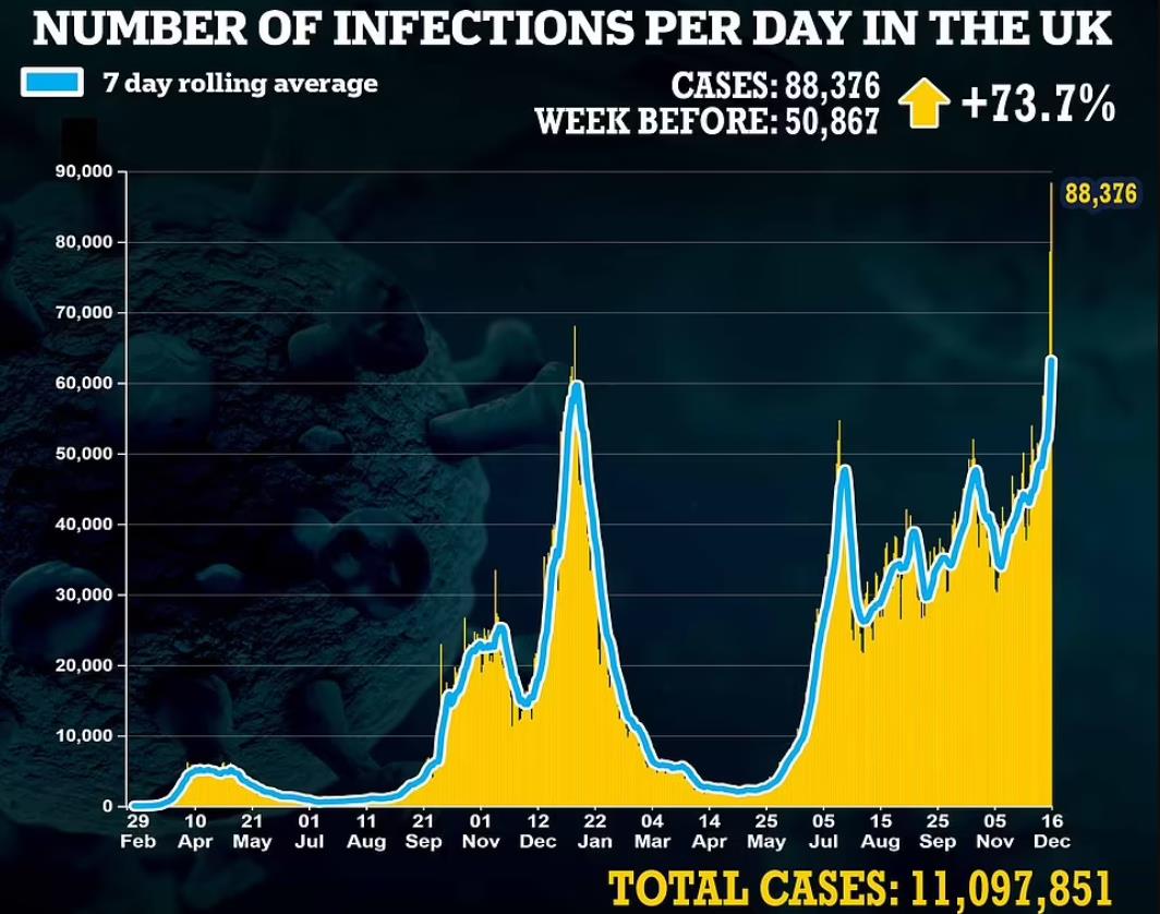 官方数据显示,本周四,英国新增确诊88,376例,一天内激增12%,较上周同比增加73.7%,再创历史新高。