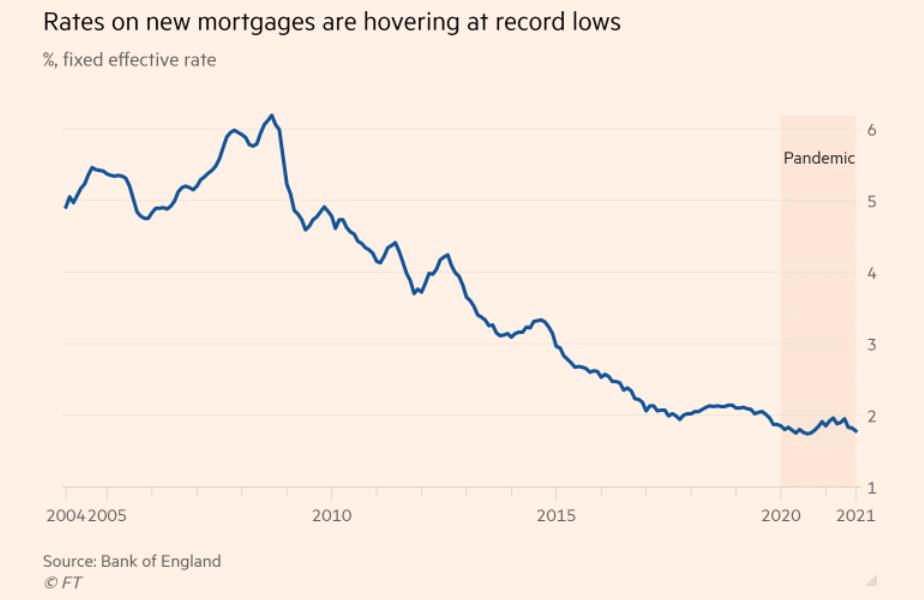 数据显示,今年9月,英国新发放抵押贷款的平均“有效”利率(实际支付的利率)为1.78%,远低于2008年6.2%的高点。