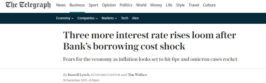 据一些经济学家的预测,英国央行将在2022年连续加息三次,并且基准利率可能最早会在明年初升至0.5%,并在8月份升至1%。