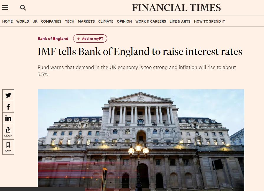 面对不断飙升的通胀,国际货币基金组织(IMF)亲自下场,督促英国央行加息。