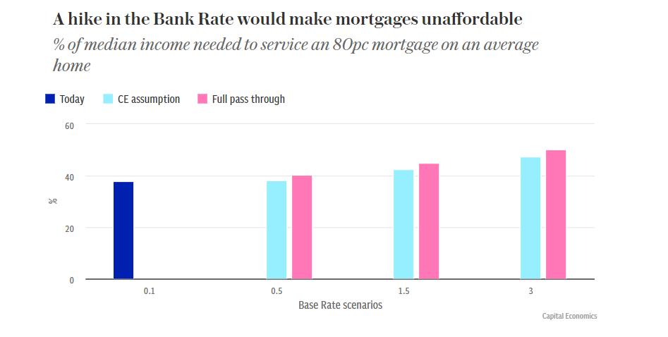 如果银行利率上调至3%,则意味着每月的还款额将增加200英镑,即使部分被银行吸收,这也将使月供占到平均收入的47.5%。