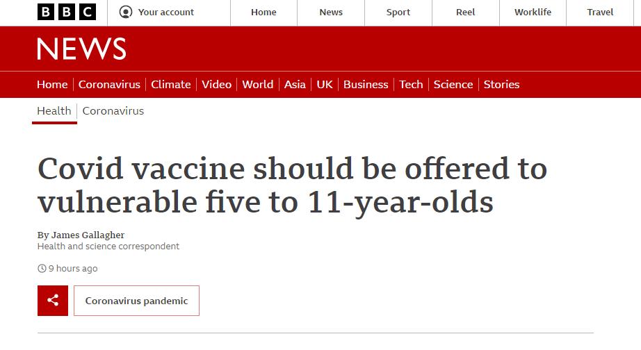 目前,由于认为儿童感染新冠后的风险较小,英国仅决定为12岁以上的健康儿童接种疫苗,并建议向以下未成年人提供正常的加强剂量: