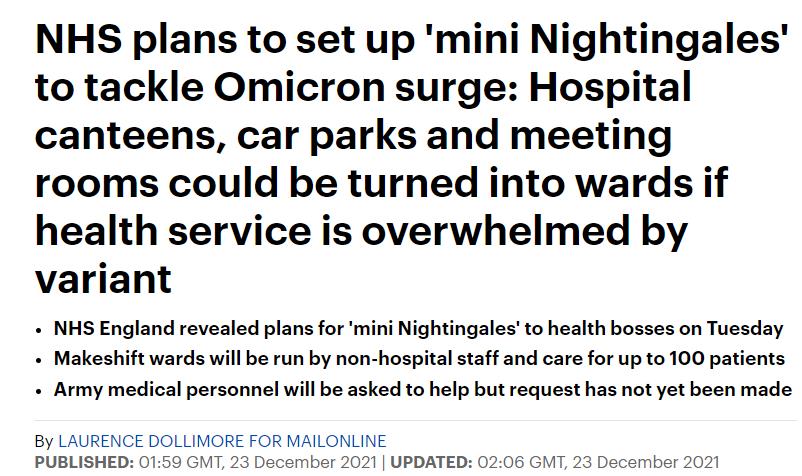 还有媒体称,如果Omicron导致住院人数激增且高于之前的峰值水平,NHS可能会在停车场设立“临时医院”来应对疫情发展。