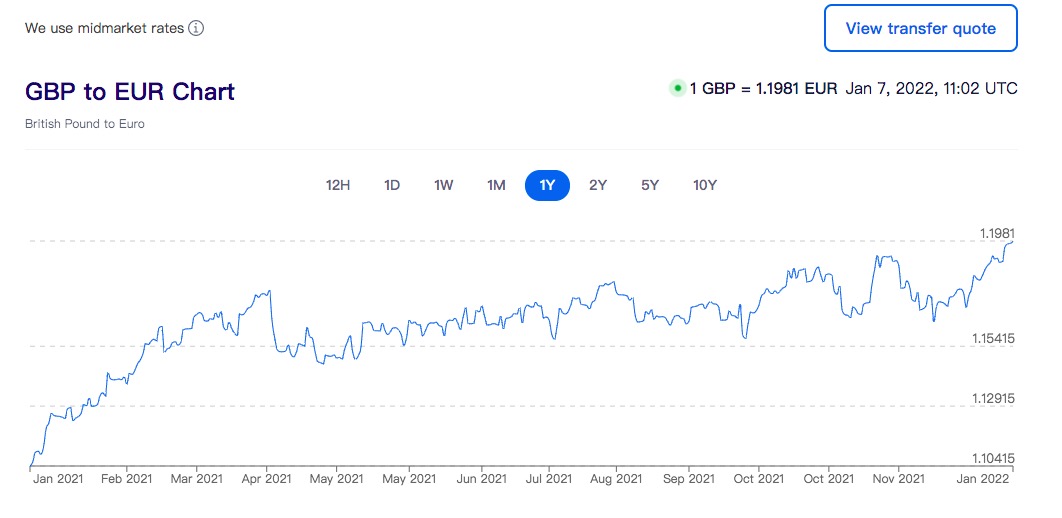 兑换欧元汇率为1 GBP = 1.1981 EUR