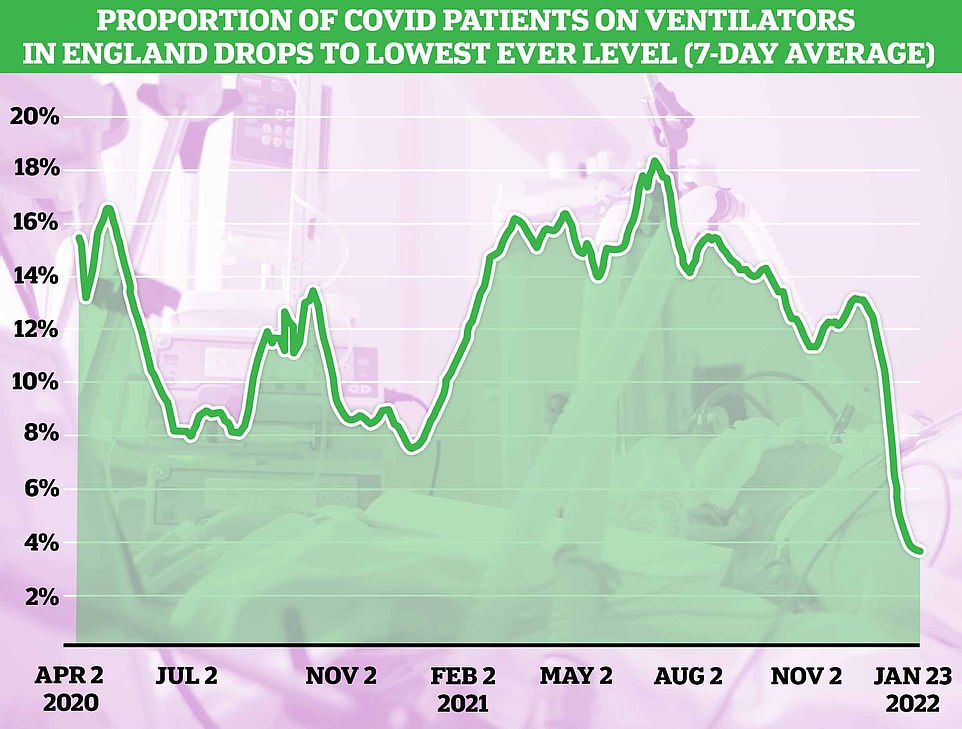 英格兰3.7%的住院患者(14,334人中有524人)使用呼吸机,这是疫情有记录以来最低的比例。